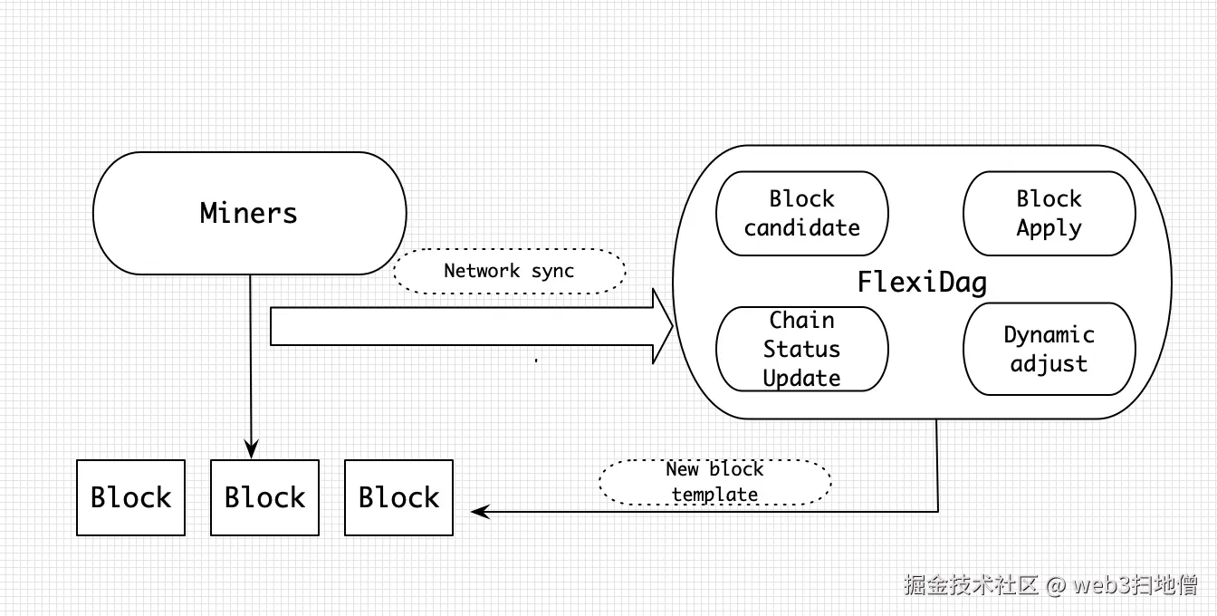 2) 基于DAG结构。StarStack中引入了DAG结构之后,结合自身创新推出FlexiDAG,可以做到动态调整出块时间、难度和出块奖励,缩短交易确认时间,大幅提升了 网络性能和系统效率。