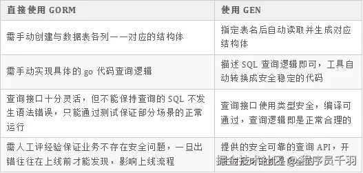 GEN 采用了类型安全限制,所有参数都做了安全限制,完全不用担心存在注入; 最重要的是自定义 SQL 只需要通过模板注释到 interface 的方法上,自动帮助你生成安全的代码,是的,自定义 SQL 也不会出现 SQL 注入问题,而且工具完美兼容 GORM!