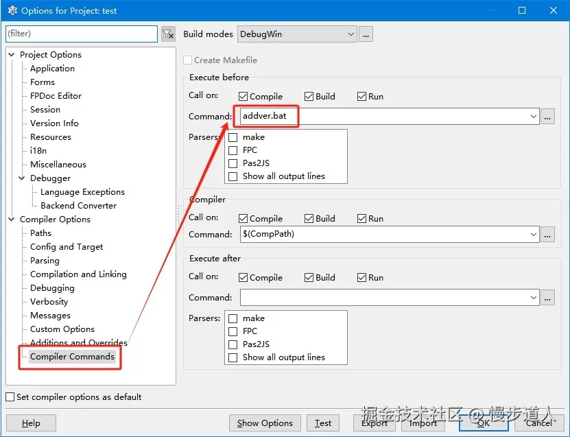 Project->Project Options...对话框,在Compiler Options->Compiler Commands->Execute before中添加脚本的路径。