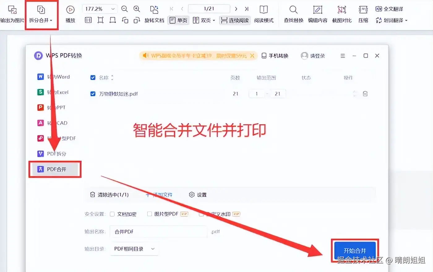 接下来,在工具栏中找到类似 【拆分合并】 的选项,接着按照需求进行合并。最后,将合并好的文件打印即可。