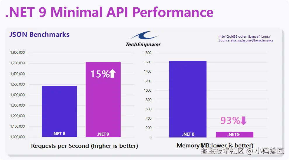 TechEmpower 基准测试显示,.NET 9 在吞吐量上显著提高,同时内存使用量大幅下降,这主要得益于服务器 GC 的优化。