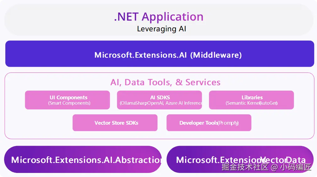 强大的生态系统意味着开发人员有更多选择来决定最适合他们的场景。为了简化这些集成并降低进入障碍,我们与 Semantic Kernel 合作,在 Microsoft.Extensions.AI 和 Microsoft.Extensions.VectorData 下引入了一组抽象,为与 AI 服务交互提供统一的 C# 抽象层。这些抽象支持小型和大型语言模型(SLM 和 LLM)、嵌入、向量存储和中间件。早期采用者如 Pieces 和 OllamaSharp 已经受益于这种新的简化方法。