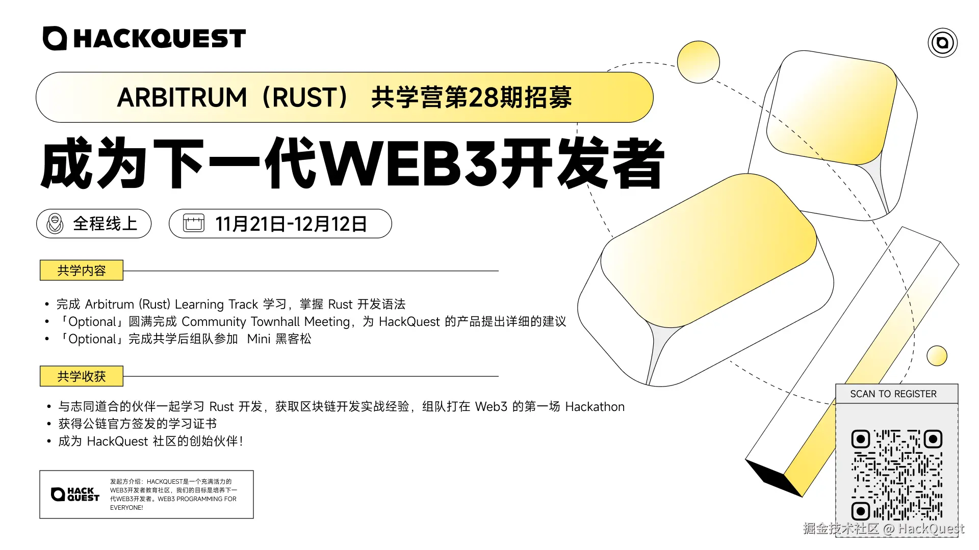 本次学习当中我们将学习 Rust 语法,以及针对 Arbitrum 生态进行实战开发,最终参与到结营后的 HackQuest 黑客松。