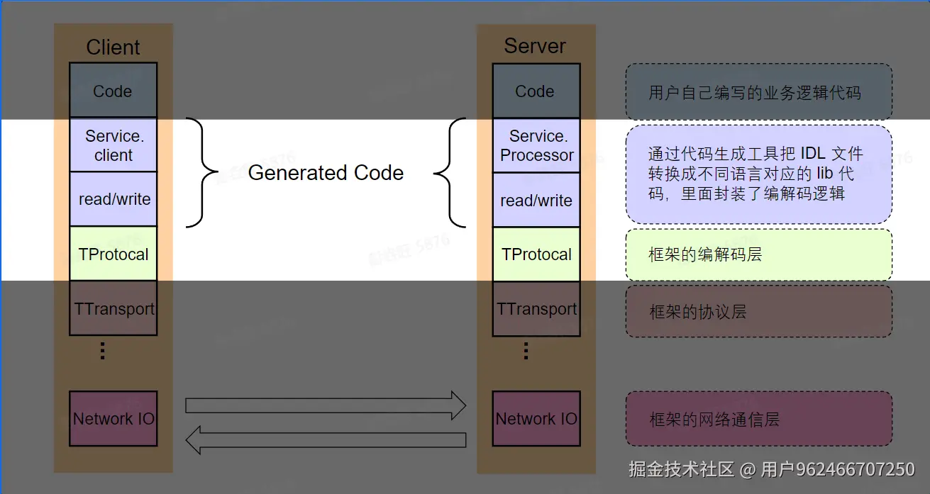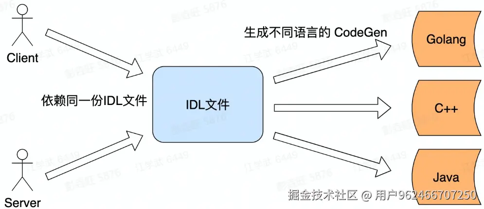 服务双方通过约定的规范进行远程调用,双方都依赖同一份 IDL 文件,需要通过工具来生成对应的生成文件,具体调用的时候用户代码需要依赖生成代码,所以可以把用户代码和生成代码看成一个整体。