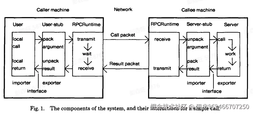 在 1984 的时候 Nelson 发表了论文,提出 RPC 的过程是由 5 个模型组成: User、User-Stub、RPC-Runtime、Server-Stub、Server。如下图