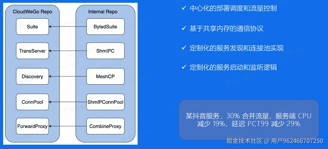 目前集成的自研的 Netpoll,基于 netpoll 实现的 http2 库,用于 mesh 场景通过共享内存高效通信的 shm-ipc,以后也可以增加对 RDMA 支持的扩展