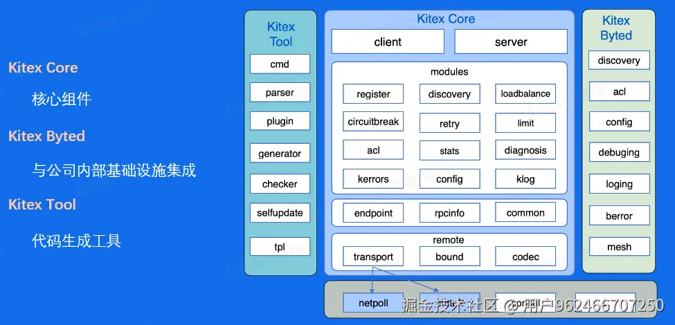 右边绿色的 byted 是对字节内部的扩展,集成了内部的二方库还有与字节相关的非通用的实现,在第二节高级特性中关于如何扩展 kitex 中介绍,byted 部分是在生成代码中初始化 client 和 server 时通过 suite 继承进来的,这样实现的好处是与字节的内部特性解耦,方便后续开源拆分。