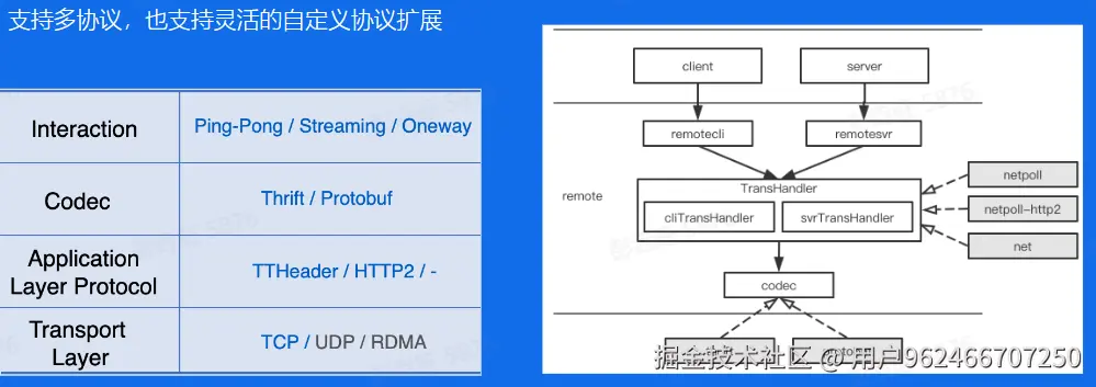 :::info kitex 支持多协议的并且也是可扩展的,交互方式上前面已经说过支持 ping-pong、streaming、oneway