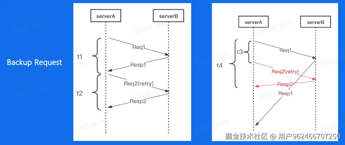我们预先设定一个阙值 t3(比超时时间小,通常建议是 RPC 请求延时的 pct99),当 Req1 发出去后超过 t3 时间都没有返回,那我们直接发去重试请求 Req2,这样相当于同时有两个请求运行。然后等待请求返回,只要 Resp1 或者 Resp2 任意一个返回成功的结果,就可以立即结束这次请求,这样整体的耗时就是 t4,它表示从第一个请求发出到第一个成功结果返回之间的时间,相比于等待超时后再发出请求,这种机制能大大减少整体延时。