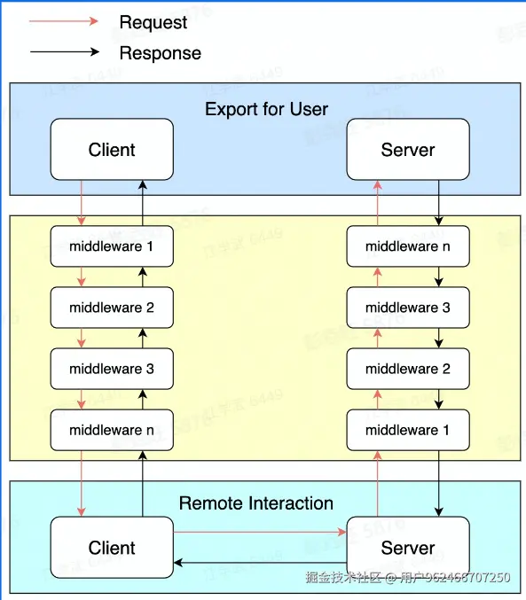 一次请求发起首先会经过治理层面,治理相关的逻辑被封装再 middleware 中,这些 middleware 会被构造成一个有序调用链逐个执行,比如服务发现、路由、负载均衡、超时控制等,mv 执行后就会进入到 remote 模块,完成与远端的通信。