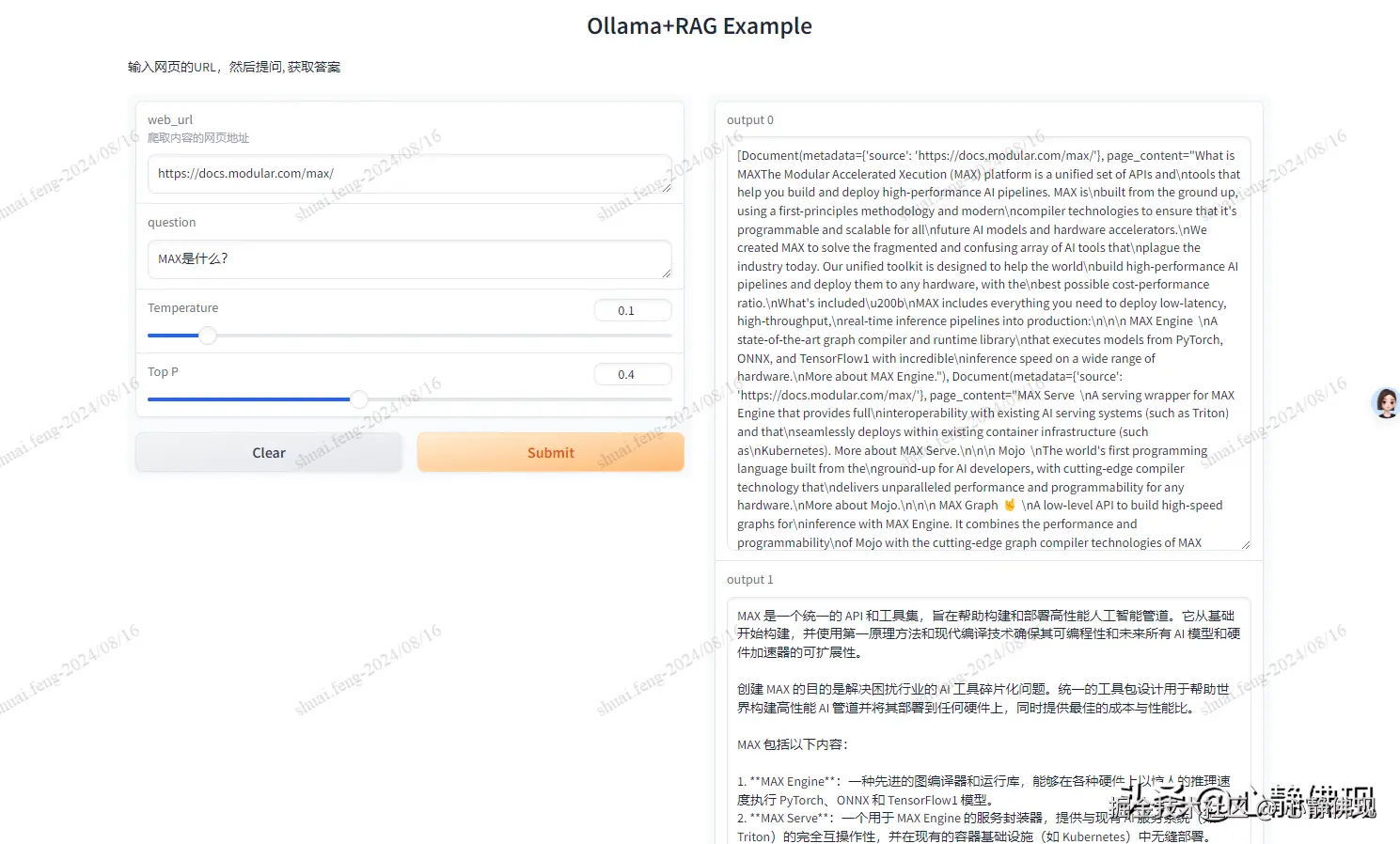 - gr.Interface: 创建一个 Gradio 接口,允许用户输入数据并通过 fn 参数指定的函数获取输出。inputs: 输入字段,包括一个文本框(用于输入 URL)、一个文本输入框(用于提问)和两个滑动条(用于调整温度和 top_p 值)。outputs: 输出字段,包括两个文本输出框,分别显示分割后的文档和答案。title 和 description: 设置接口的标题和描述。