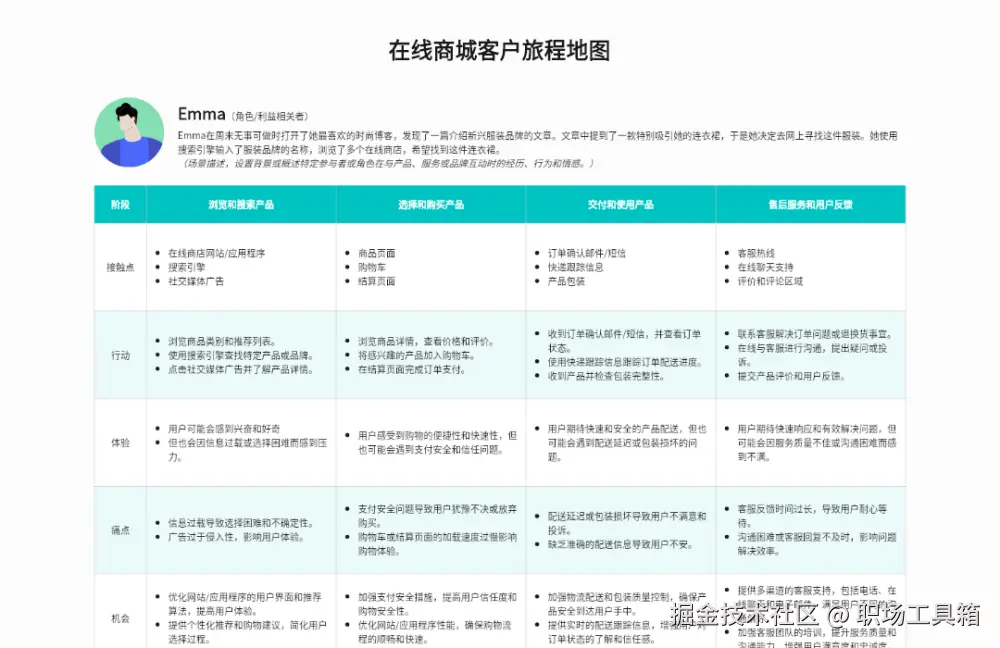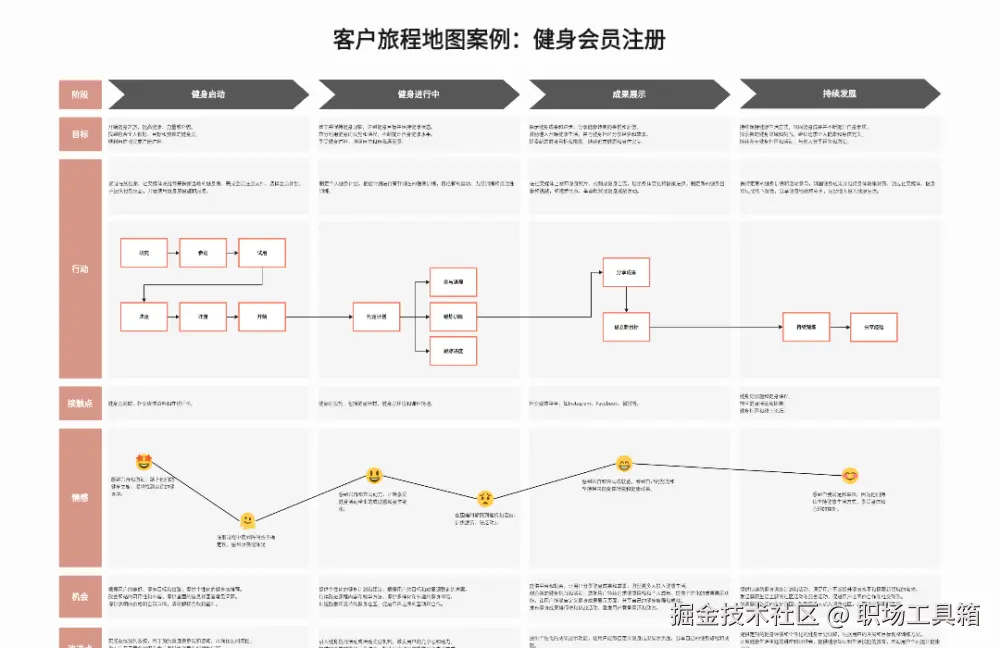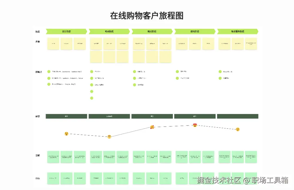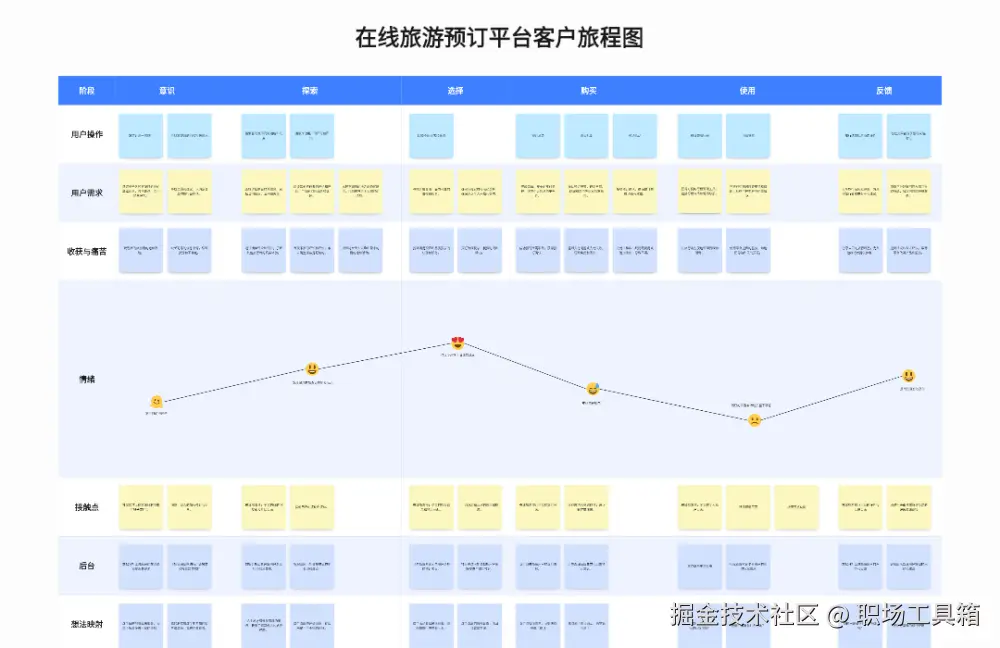 当然,要是每天得面对堆积如山的需求和todolist,我们很难抽出整块的时间来画用户旅程图,对于这种情况,更好的方式是复用现成的用户旅程图模板,用户旅程图模板一般都提供了基础的框架和案例内容,我们只需简单修改编辑其中的内容,就能快速得到一个精美的用户旅程图。