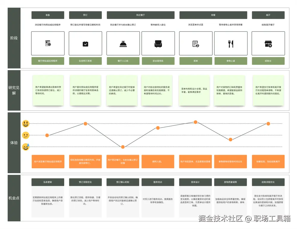 餐厅用餐体验的用户旅程地图揭示了顾客在用餐过程中的各个阶段的行为和需求。这个用户旅程图模板帮助餐厅从顾客的角度出发,了解他们在预订、到达餐厅、点菜、用餐、结账等环节的体验,发现顾客的关注点、需求痛点和期望。
