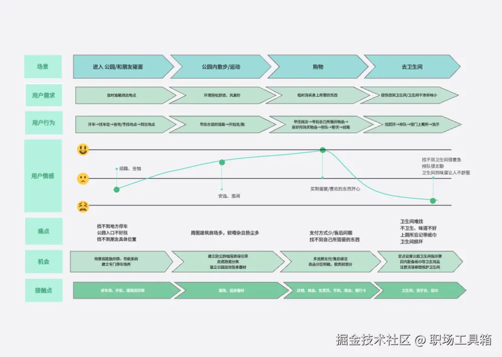 公园服务用户旅程图通过图形化的方式,展示了游客在公园内的行为和需求。这个模板帮助管理者从游客的视角出发,理解他们的情感和体验,从而针对性地提升服务质量。它揭示了服务流程中的痛点和改进空间,优化每个触点的体验,提高服务效率和质量,增强游客的满意度和忠诚度。