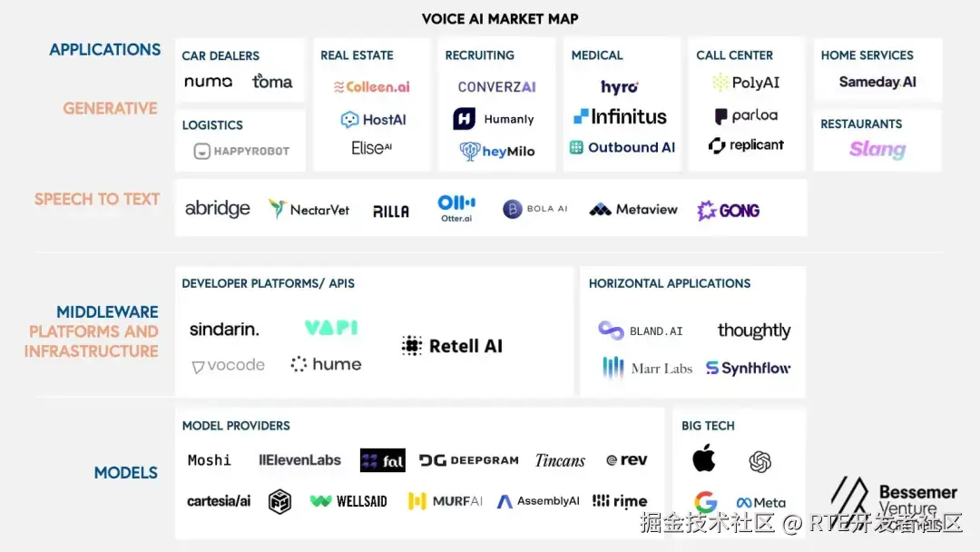 开发者平台: 虽然底层模型在延迟、成本和上下文窗口方面取得了显著进步,但构建语音智能体和管理实时语音基础设施对开发者来说仍然极具挑战性。为此,一系列专注于语音的开发者平台应运而生,旨在帮助开发者简化大部分复杂流程。这些开发者工具可以帮助解决几个核心挑战,包括: