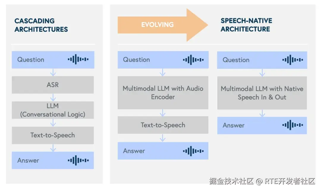 其次,STS(Speech-To-Speech,语音到语音)模型的兴起带来了突破性进展。这些模型专为处理基于语音的任务而设计,无需将音频转录成文本。 它们有效解决了传统级联架构的主要局限性,特别是延迟和对话动态问题。与以往的模型不同,语音原生模型直接处理原始音频输入和输出,带来了显著的改进: