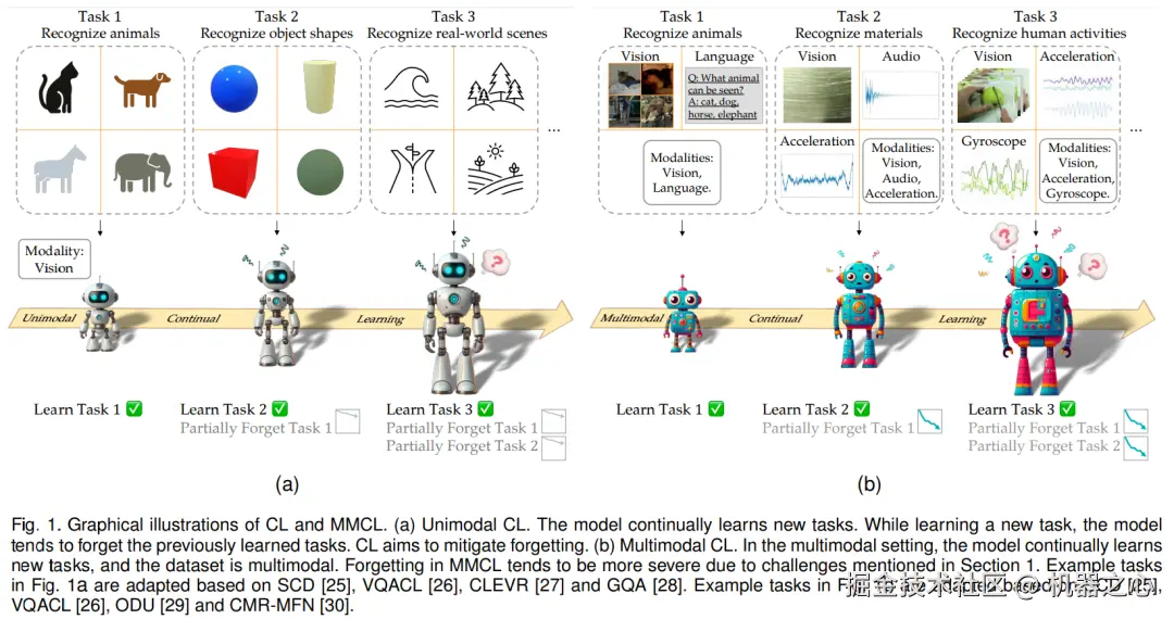 连续学习(CL)旨在增强机器学习模型的能力,使其能够不断从新数据中学习,而无需进行所有旧数据的重新训练。连续学习的主要挑战是灾难性遗忘:当任务按顺序训练时,新的任务训练会严重干扰之前学习的任务的性能,因为不受约束的微调会使参数远离旧任务的最优状态。尽管连续学习取得了重大进展,但大多数工作都集中在单一数据模态上,如视觉,语言,图,或音频等。这种单模态的关注忽略了现实世界环境的多模态本质,因为现实世界环境本身就很复杂,由不同的数据模态而不是单一模态组成。