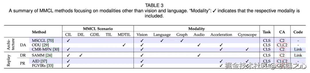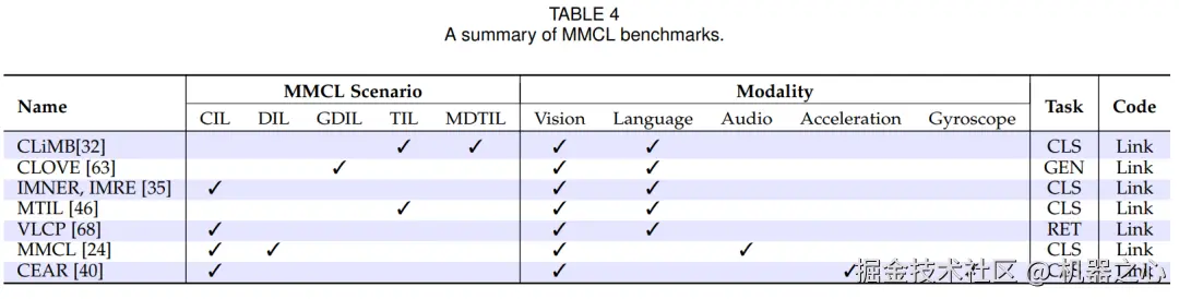 大多数 MMCL 数据集是从最初为非连续学习任务设计的知名数据集中改编而来的,研究人员通常会利用多个数据集或将单个数据集划分为多个子集,以模拟 MMCL 环境中的任务。此外,也存在一些专门用于 MMCL 的数据集,例如 P9D 和 UESTC-MMEA-CL。下表总结了涵盖各种连续学习场景、模态和任务类型的 MMCL 基准。