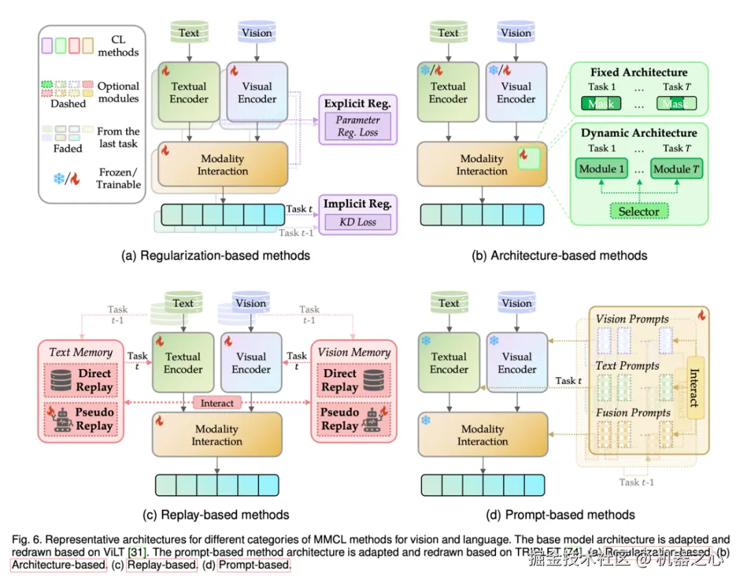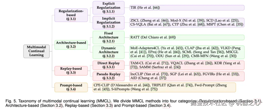 为了应对上述挑战,研究人员越来越关注 MMCL 方法。作者将 MMCL 方法分为四类主要方法,即基于正则化、基于架构、基于重放和基于提示的方法。