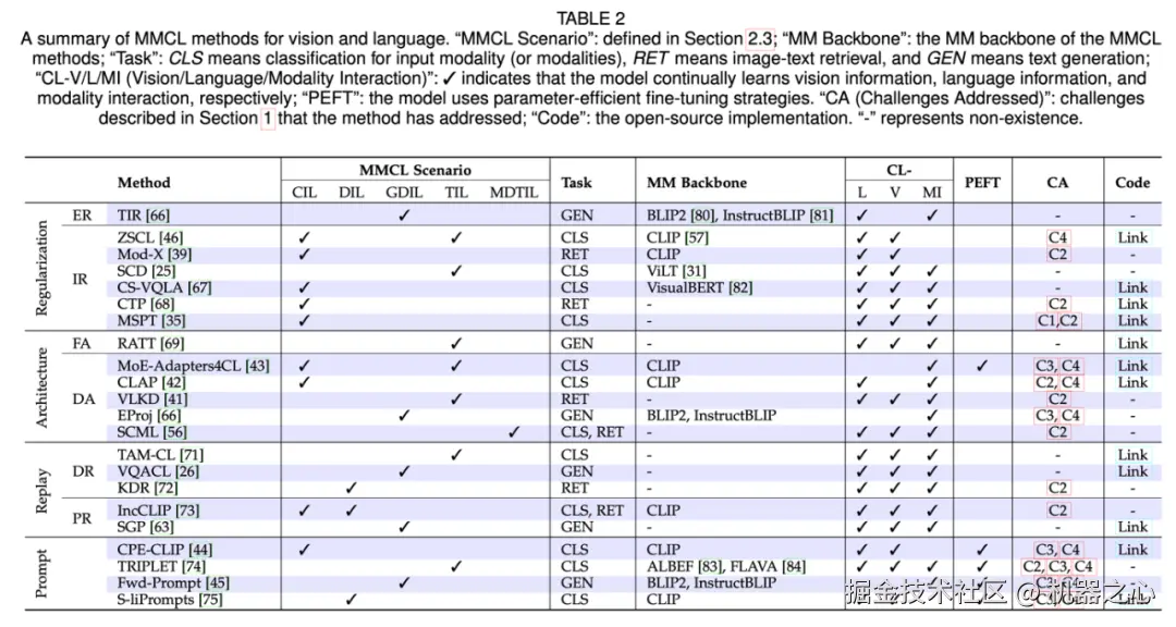 挑战 4 预训练零样本能力的退化:随着预训练模型的进步,MMCL 方法可以用这些强大的模型。这些预先训练好的多模态模型经常会表现出零样本能力。然而,在训练过程中,该能力可能会减弱。这种退化风险可能导致未来任务上的严重性能下降,这被称为 MMCL 中的负前向知识转移。