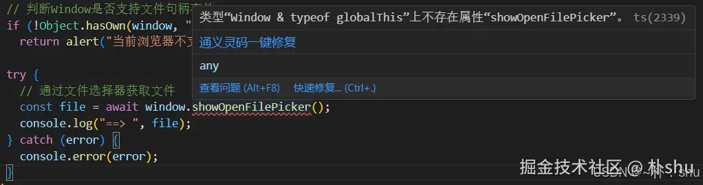 如上演示效果,尽管已经可以调用文件,但是 ts 还是报错了,可以通过自定义 Window 的接口来解决这个问题,明确告诉window上存在这个方法即可,还可以拓展一些其他的属性,便于后期的操作哈~
