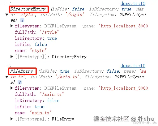 DataTransferItem 接口的 getAsFileSystemHandle() 方法返回一个 FileSystemFileHandle(若拖动的项目是文件),或 FileSystemDirectoryHandle(若拖动的项目是目录)。