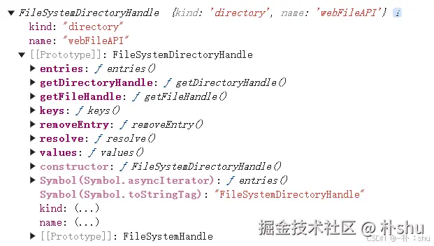 FileSystemHandle 接口是代表一个文件或一个目录的对象,在大多数情况下,你不会直接使用 FileSystemHandle,而是会用到它的 FileSystemFileHandle 和 FileSystemDirectoryHandle 子接口。