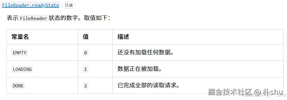 通常,FileReader 是异步的,因为读取文件内容是需要时间的,因此,可以通过监听 load 实现读取成功完成时回调处理。读取文件还能将文件读成多种结果类型: