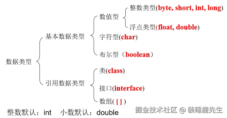 - 按数据类型分为基本数据类型和引用数据类型。基本数据类型有布尔型(boolean)、字符型(char)、数值性【整数类型(byte、short、int、long)、浮点类型(float、double)】;引用数据类型有类(class)、接口(interface)、数组。