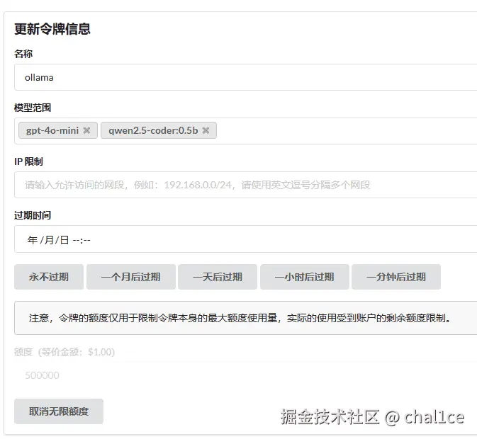 接下来到令牌那一区域,增加一个令牌,也就是你的api key,里面的模型范围把你部署的模型填上去,其他的无所谓,自己按照自己的需求来设置,设置完后记得保存。