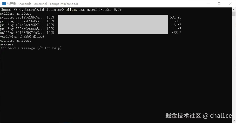 它会自动从网上拉取模型,当下载验证完毕之后它会自动运行,此时就可以在命令行里面和它交互对话了: