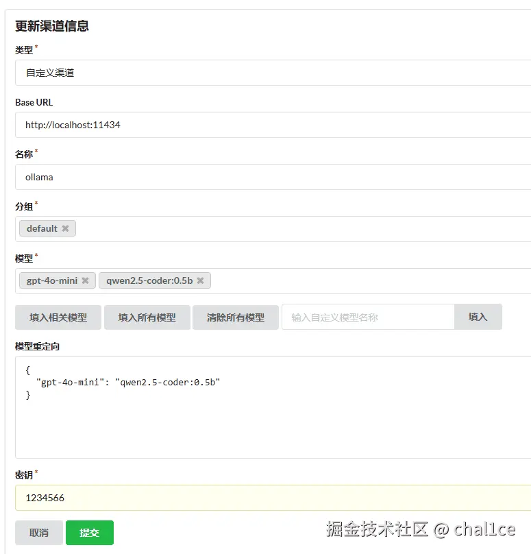 打开你的one-api地址之后,进去设置渠道信息,这里用ollama一定要设置成为自定义渠道,否则在访问模型时会报错。Base url默认是本地11434接口,至于名称、分组、密钥随便填就行,模型重定向可以不填,自定义模型名称要填入qwen2.5-coder:0.5b,也就是你运行的模型的完整名称,忽略掉我里面的4o相关的信息,如图所示: