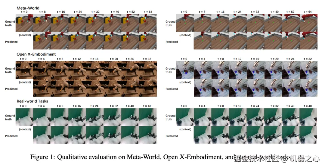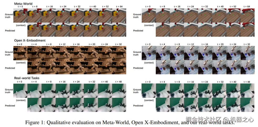 图 1 展示了在 Meta-World、Open X-Embodiment 和研究团队设计的真实任务上的定性评估结果。