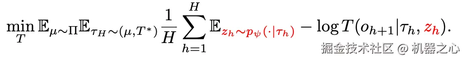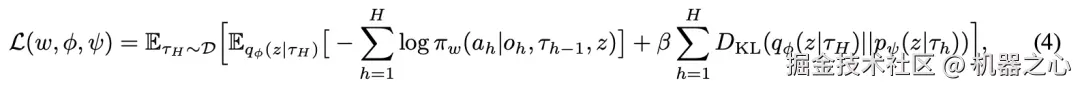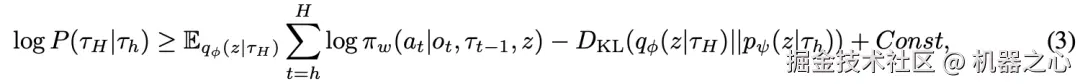 作者希望将训练轨迹 τ_H 中的决策模式提取到行为嵌入中,这让人联想到以历史 τ_h 为条件的轨迹似然 ELBO(evidence lower bound)的最大化: