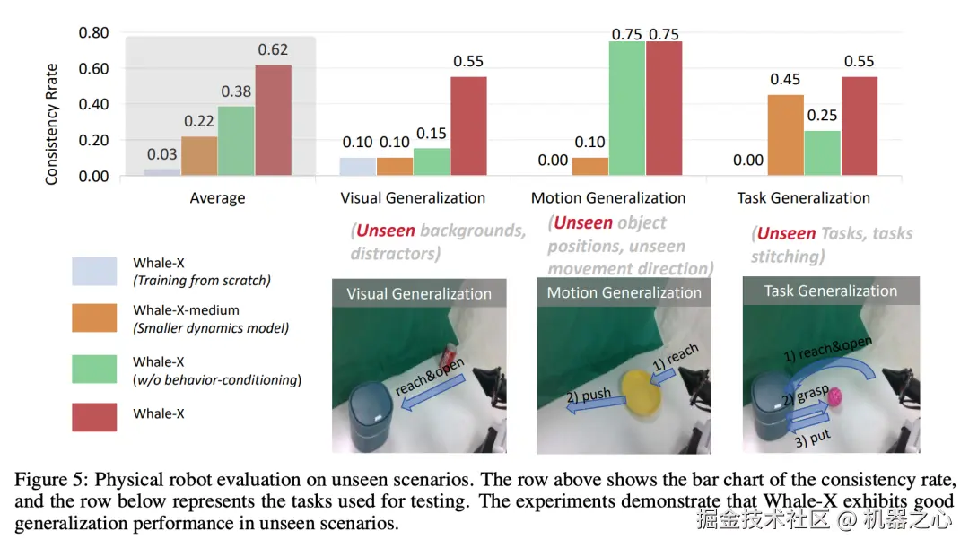 为了评估 Whale-X 在实际物理环境中的泛化能力,研究团队在 ARX5 机器人上进行了全面实验。