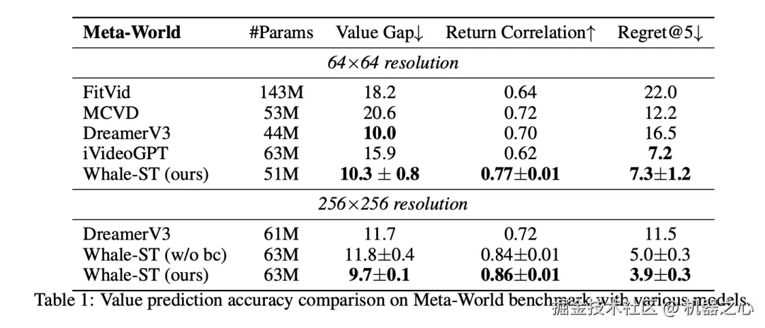 下表展示了预测准确性的结果,其中,Whale-ST 在所有三个指标上都表现出色。在 64 × 64 的分辨率下,Whale-ST 的值差与 DreamerV3 的最高分非常接近。当在更高分辨率 256 × 256 测试时,Whale-ST 的表现进一步提升,取得了最小的值差和最高的回报相关性,反映了 Whale-ST 能更细致地理解动态环境。