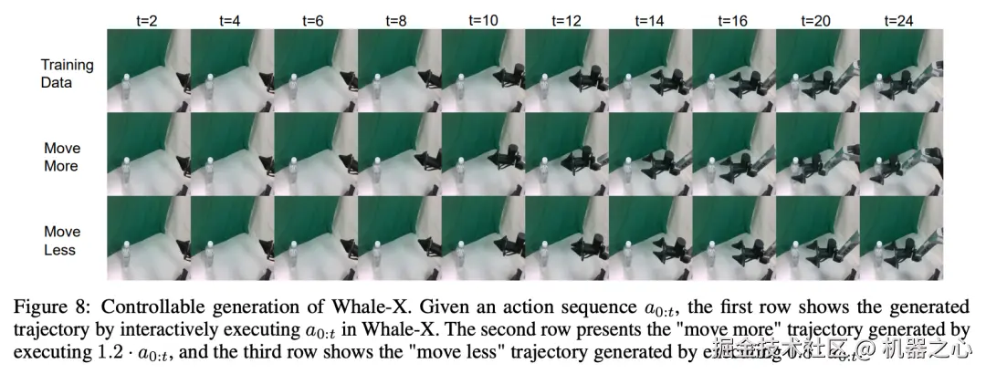 图 8 展示了 Whale-X 在控制性和泛化性方面的强大能力。给定一个未见过的动作序列,Whale-X 能够生成与人类理解相符的视频,学习动作与机器人手臂移动之间的因果联系。