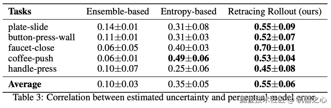 下表展示了模型误差预测的结果,在所有 5 个任务中,retracing-rollout 均优于其他基线方法。与基于集成的方法相比,retracing-rollout 提升了 500%,与基于熵的方法相比,提高了 50%。