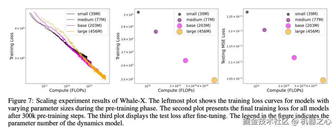 为此,他们微调了一系列动态模型,结果如图 7 最左侧所示。不难发现,经过微调后,更大的模型在测试数据上表现出更低的 loss,进一步突显了 Whale-X 在真实任务中出色的扩展性。