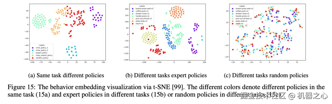 通过 t-SNE 可视化,研究表明 Whale-X 成功地学习到行为嵌入,能够区分不同策略之间的差异。例如,对于同一任务,不同的策略会有不同的行为表示,而噪声策略的嵌入则介于专家策略和随机策略之间,体现了模型在策略建模上的合理性。此外,专家策略在不同任务中的嵌入也能被区分,而随机策略则无法区分,表明模型更擅长表示和区分策略,而不是任务本身。