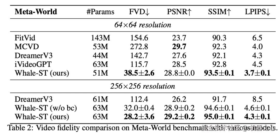 研究团队将 Whale-ST 与 FitVid、MCVD、DreamerV3、iVideoGPT 进行了对比。评估指标如下: