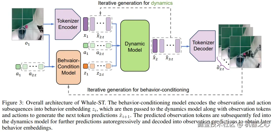 作者在论文中还给出了具体的实例。图 3 展示了 Whale-ST 的整体架构。具体来说,Whale-ST 包含三个主要组件:行为调节模型、视频 tokenizer 和动态模型。这些模块采用了时空 transformer 架构。