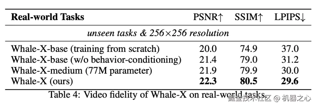 此外,视频生成质量与一致性的结果一致,如表 4 所示。通过行为 - 条件策略、大规模预训练数据集和扩展模型参数,三种策略结合,显著提高了模型的 OOD 泛化能力,尤其是在生成高质量视频方面。