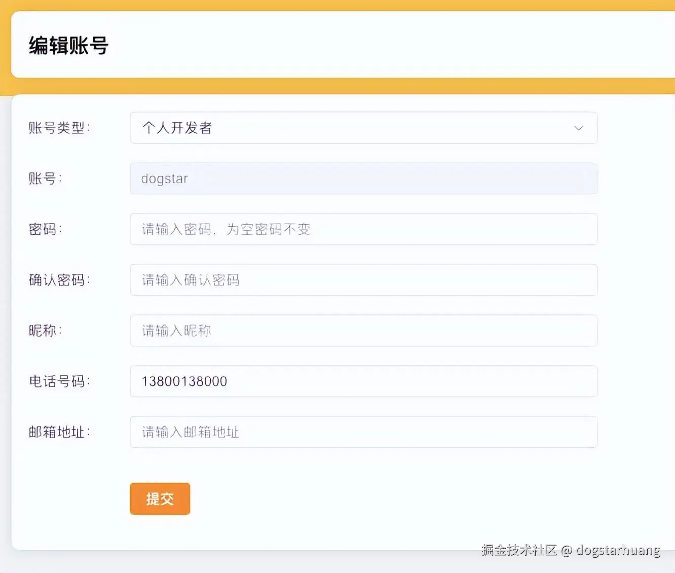 编辑账号的界面如下,可以修改:账号类型、重置密码、昵称、电话号码、邮箱地址。点击【提交】按钮,完成保存。