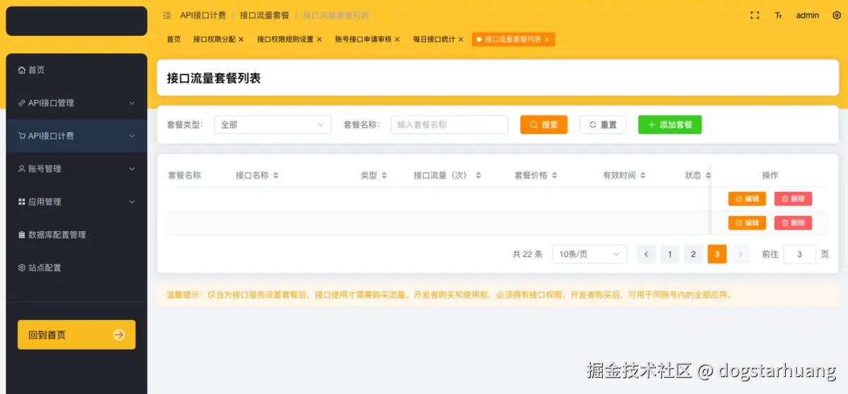 API接口计费,主要用于对接口的流量套餐进行管理。管理员点击【API接口计费】,可以进入到接口流量套餐列表管理界面。如下所示。管理员可以点击【+添加套餐】,配置新的接口套餐。也可以在列表对已配置的接口套餐进行搜索、查看和管理。点击【编辑】可以修改接口套餐,点击【删除】可以删除接口套餐。接口套餐的信息主要包括:套餐名称、接口名称、类型、接口流量(次)、套餐价格、有效日期和状态。