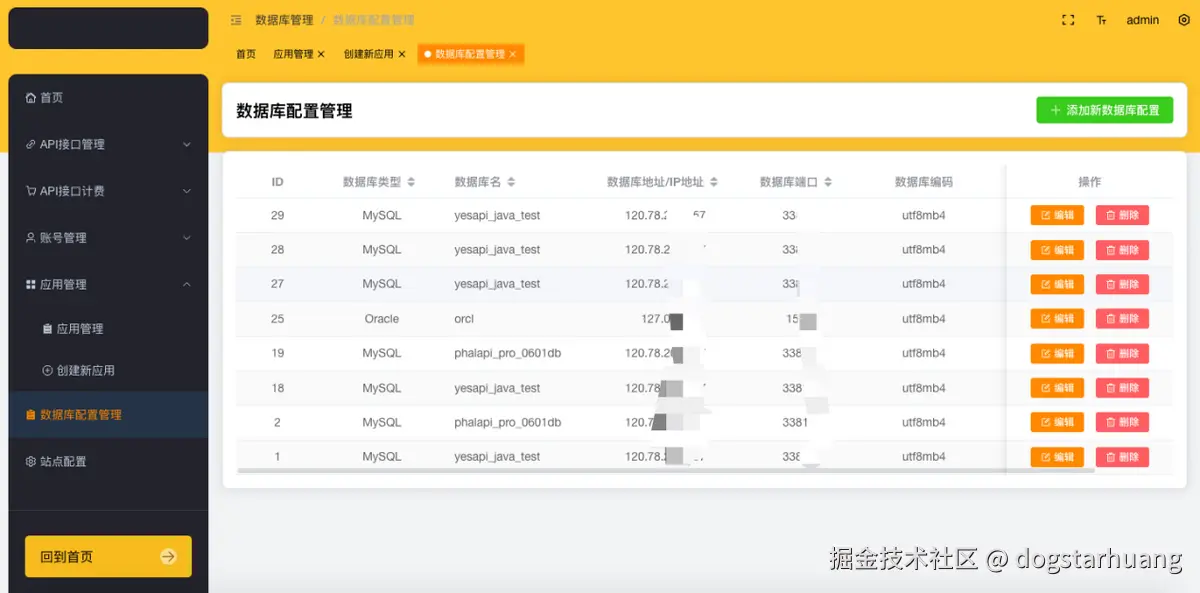 管理员点击【数据库配置管理模块】,可以进入到数据库配置管理,主要用于进行数据库连接的配置、维护和管理。成本配置后,可以提供给API接口进行调用和开发。点击【删除】可以删除不需要的配置,点击【编辑】可以继续编辑和修改数据库配置,以及进行数据库连接的测试。