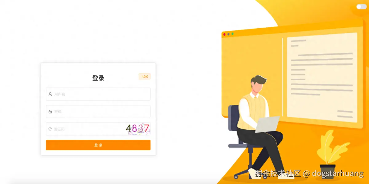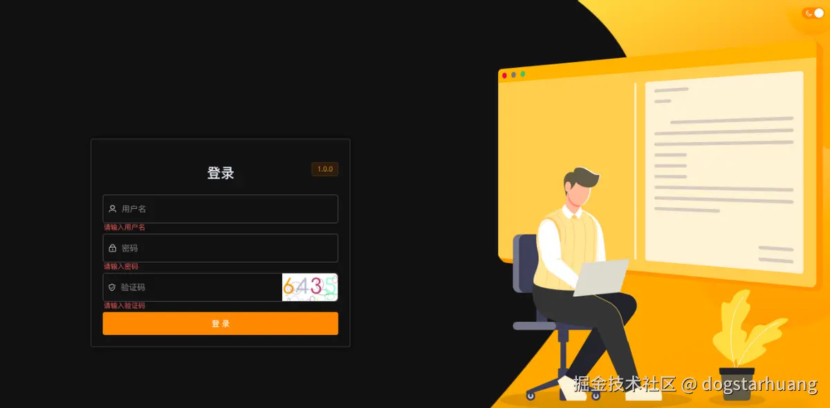 管理员在登录界面,在登录窗口输入用户名、登录密码、图形验证码,点击“登录”按钮进行登录验证。管理员用户可以切换 白天或黑夜 模式。管理后台不支持注册,只能在管理后台进行管理员的账号创建和权限分配。