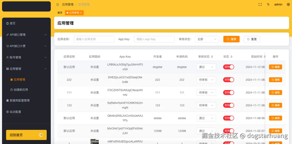 在【应用管理模块】,管理员可以对开发者应用的创建、查看、审核和管理。如下图所示。可以搜索应用名称、app key、审核状态,点击【搜索】或【重置】搜索条件。在【状态】这一列,可以点击【启用】恢复应用使用状态,点击【禁用】则禁止应用的使用。点击【编辑】可以修改应用信息。例如:修改应用名称、重置密钥等操作。