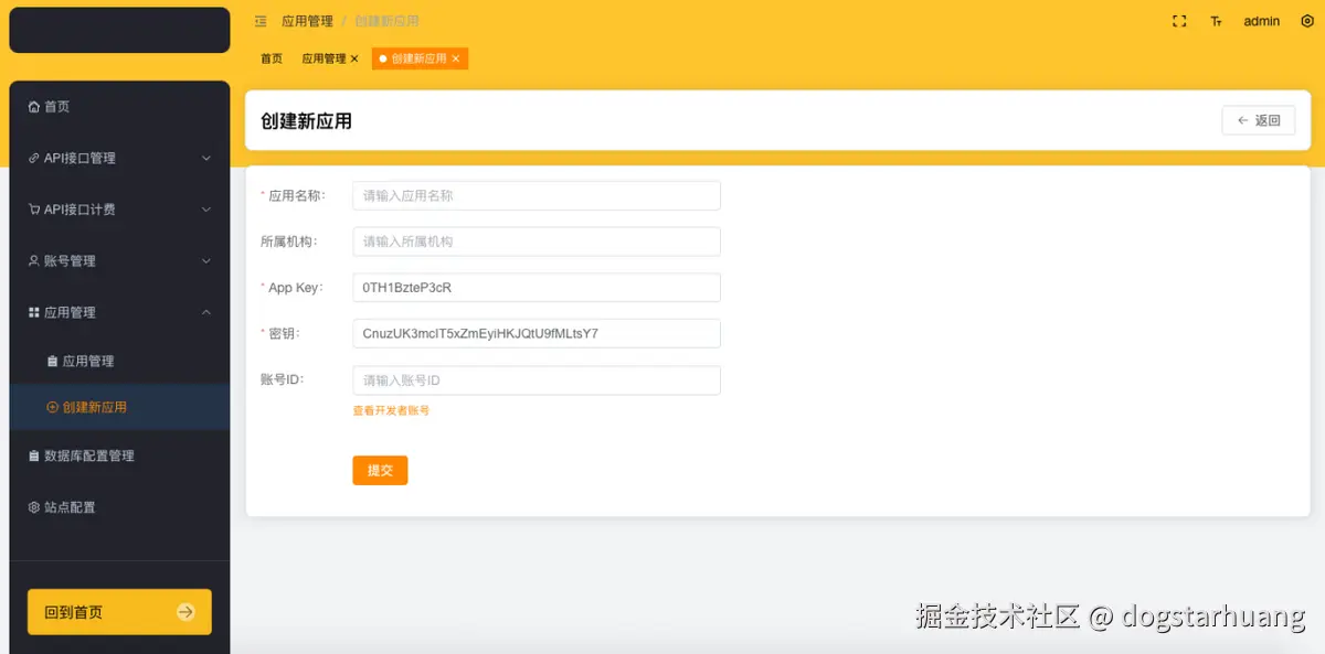 管理员点击【创建新应用】菜单,可以进入到创建新应用界面。点击【返回】放弃创建新应用。填写:应用名称、所属机构、App Key和密钥则由平台系统自动随机生成,也支持由管理员手动输入或修改、账号ID,点击【提交】完成新应用的创建。创建应用时,可以同时关联到指定的开发者账号,成功创建应用后需要继续完成前面接口权限的分配。