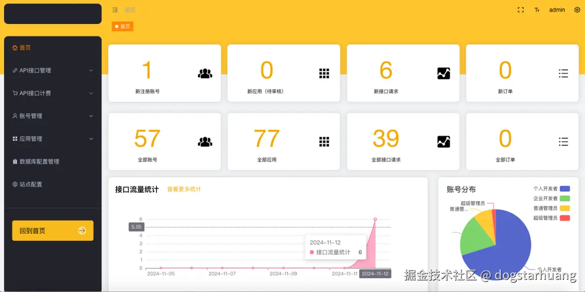 在后台首页,可以快速查看诸如:待审核应用、全部账号、今日接口请求次数、全部接口数量等整体概况。以及:接口流量统计图表、近期统计表格数据、昨日活跃App和系统授权信息等。